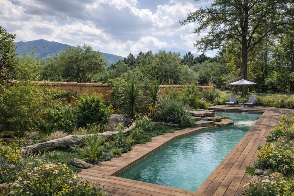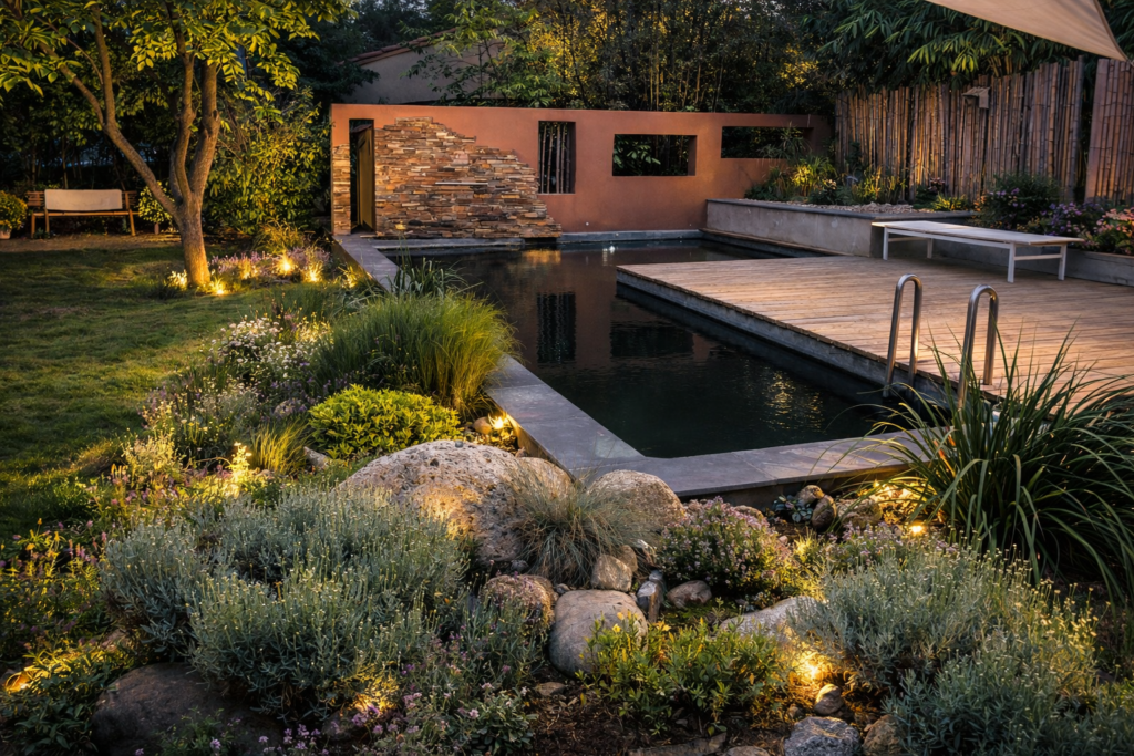 Ce jardin démontre qu’une piscine biologique peut s’intégrer dans une architecture contemporaine exigeante tout en créant une atmosphère immersive et durable.