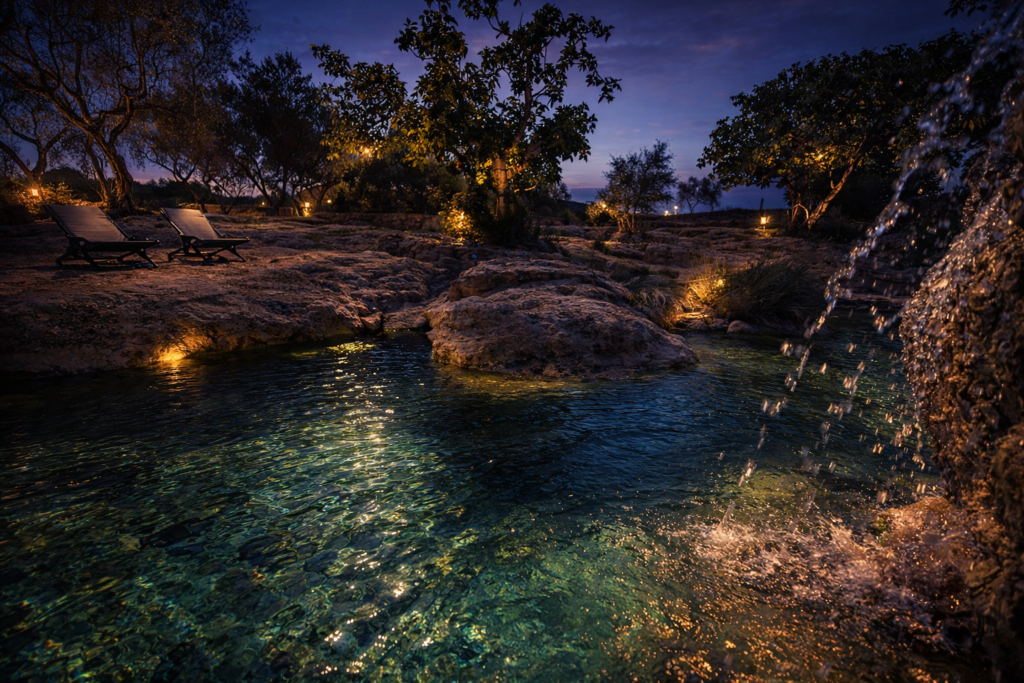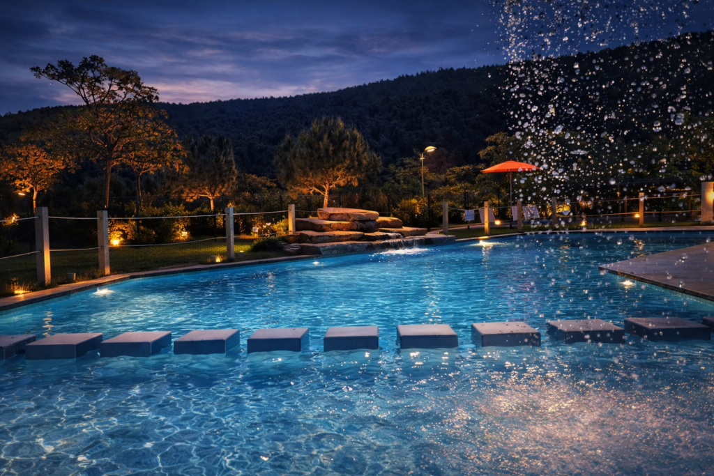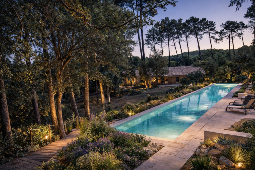 Sous les pins, au coucher du jour, le bassin s’intègre au parc paysager et devient un élément central de l’identité du lieu. Il valorise l’offre d’hébergement en proposant bien plus qu’un simple service supplémentaire : un argument distinctif.