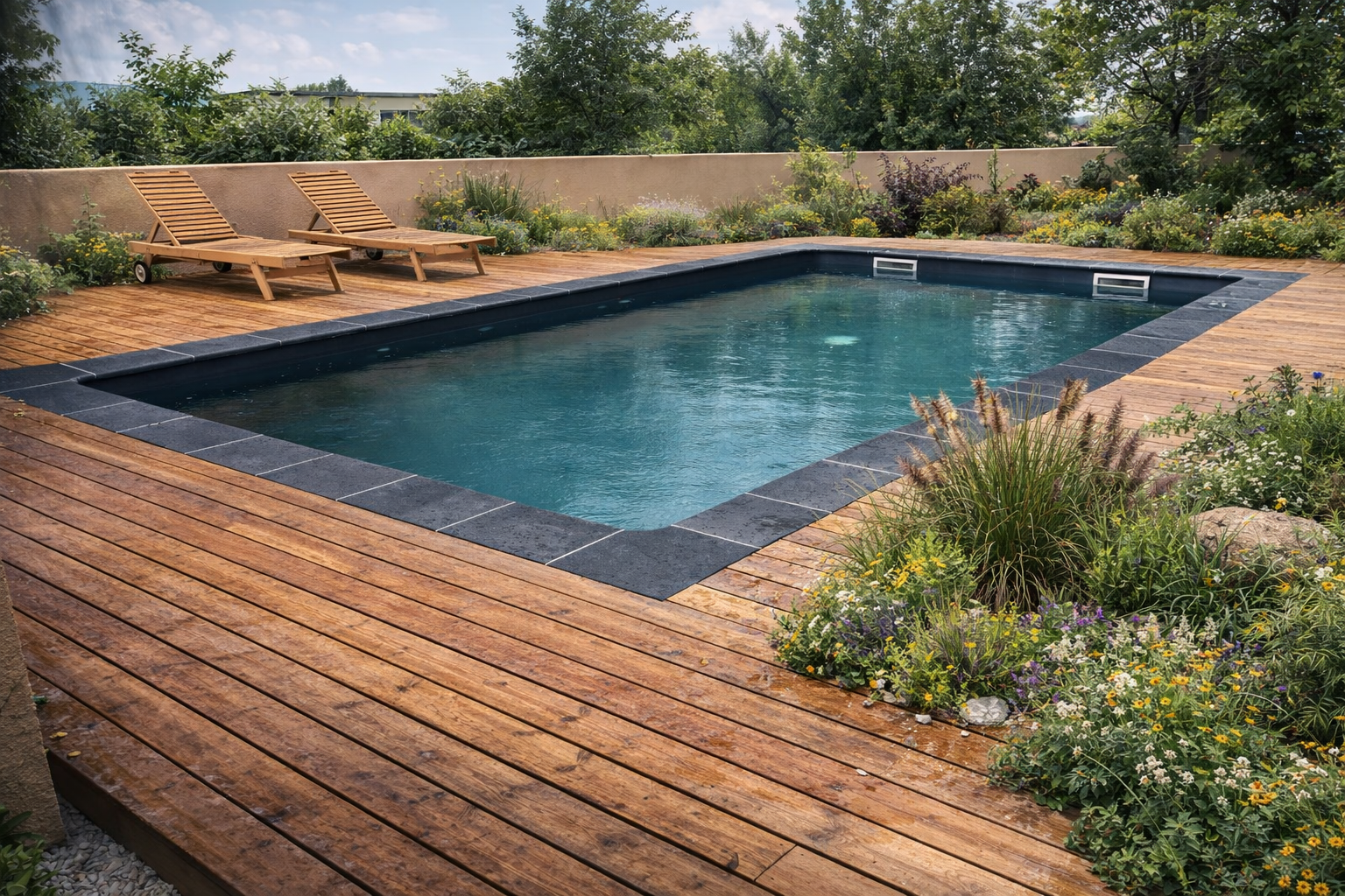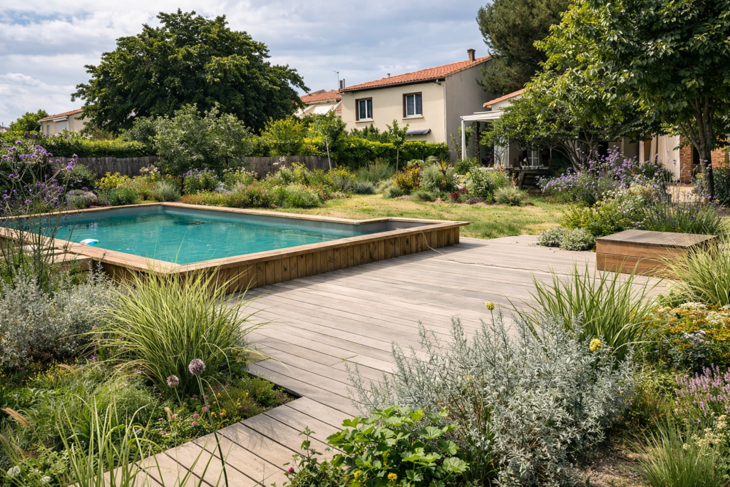La terrasse en bois structure l’espace et crée une continuité chaleureuse avec le jardin. Les massifs végétaux accompagnent le bassin sans l’enfermer, apportant douceur et saisonnalité. L’ensemble reste lisible, accessible, fonctionnel.