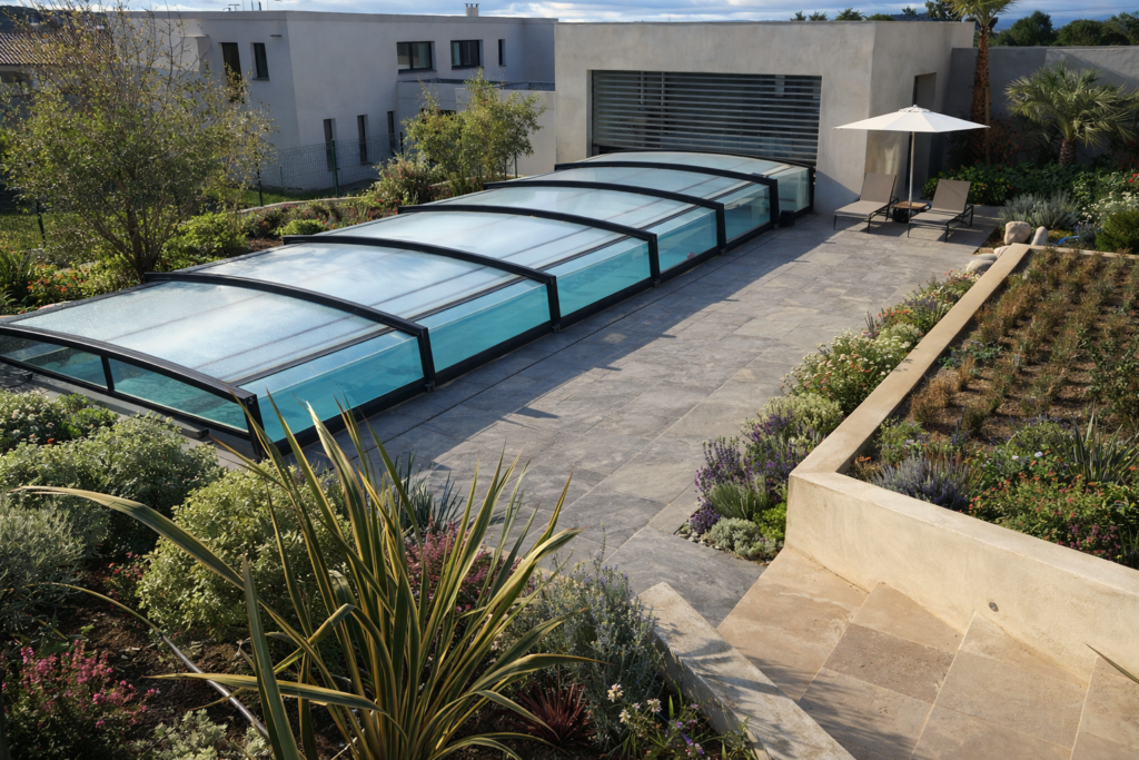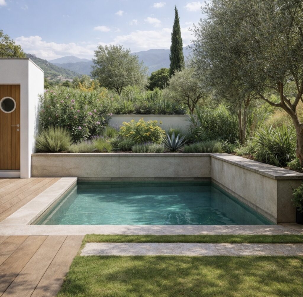 Dans ce projet, la piscine s’intègre naturellement dans un jardin méditerranéen vivant, où chaque élément du paysage a été pensé pour créer une atmosphère à la fois esthétique, durable et apaisante.