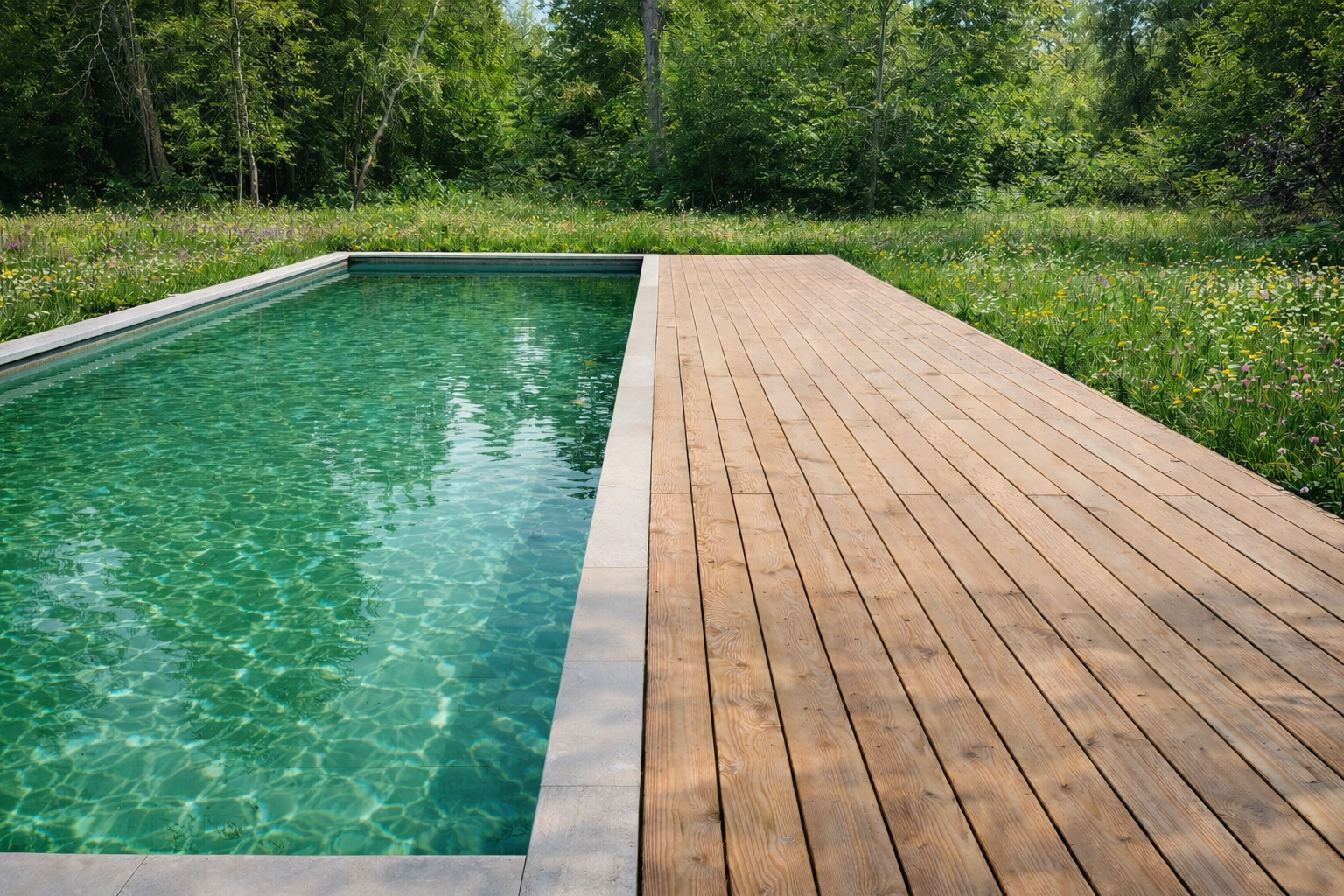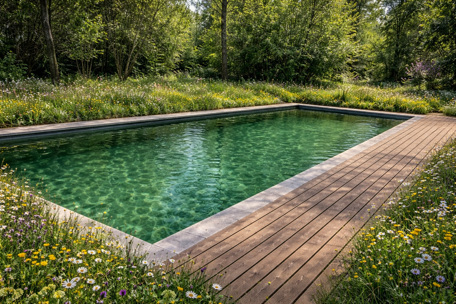 Filtration 100 % naturelle, aucune chimie, mécanique invisible : le bassin fonctionne comme un écosystème. L’eau s’autorégule, reflète les arbres, prolonge la forêt.
