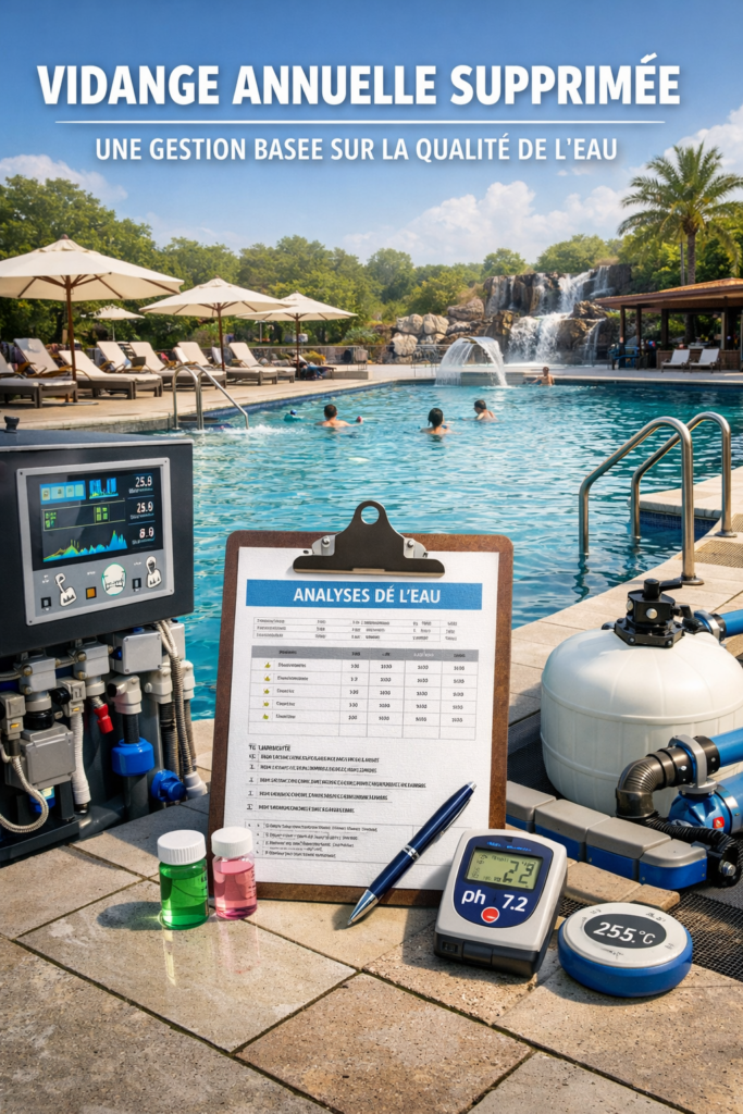Désormais, la vidange est déclenchée par la qualité de l’eau, et non par le calendrier. L’exploitant est tenu de surveiller en continu les paramètres sanitaires, et d’intervenir — notamment par une vidange partielle ou totale — lorsque les seuils réglementaires ne sont plus respectés ou lorsque les analyses l’exigent.