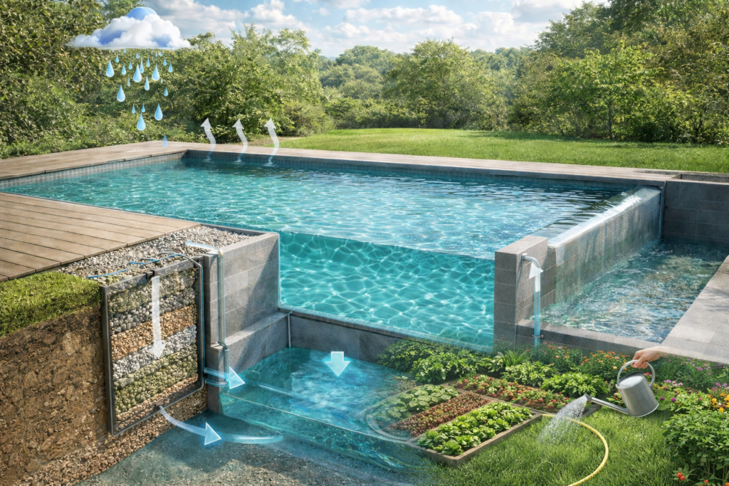 Le bassin s’intègre dans un cycle naturel de l’eau maîtrisé, limitant les pertes et favorisant une utilisation intelligente des ressources.