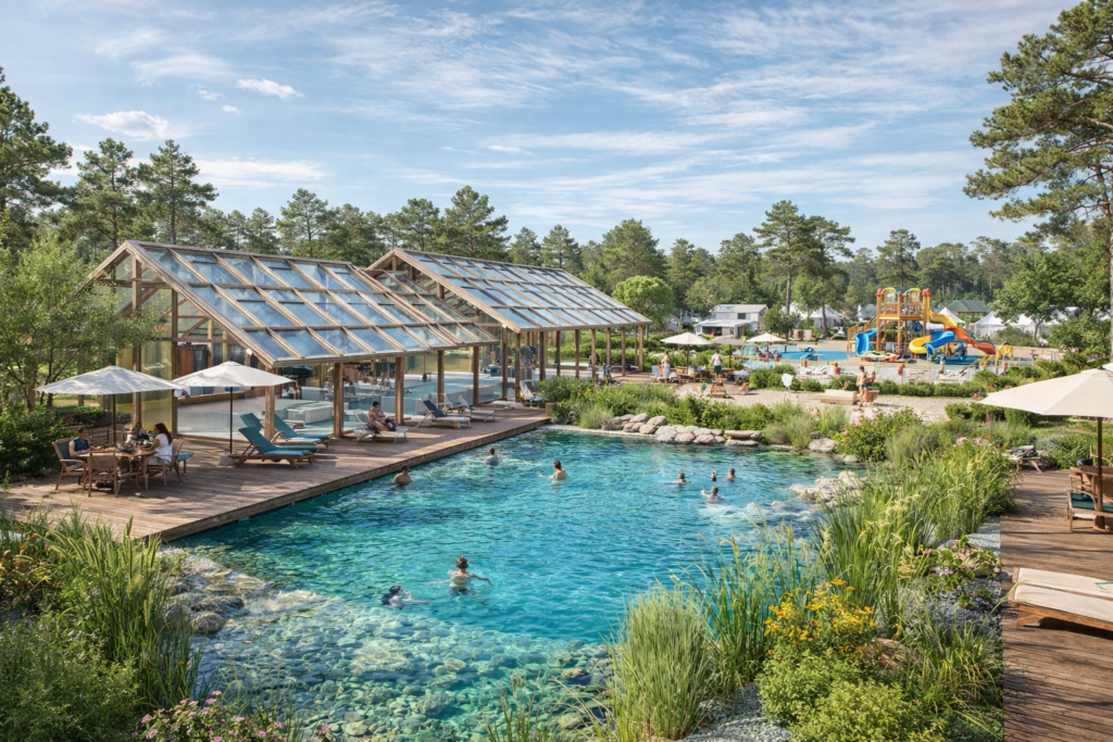 Un bassin biologique couvert, associé à des terrasses bois, des plages minérales et des espaces végétalisés, transforme l’image du camping.